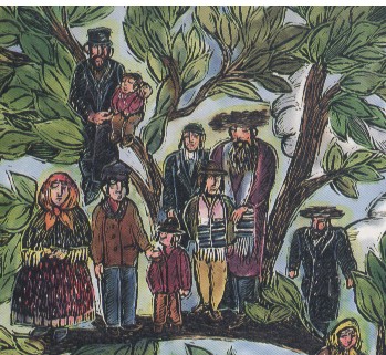 The Tree of MemoriesLithograph, 16"x20" Solomon Ben Judah Ibn Gabirol, the tenth century Spanish poet and philosopher wrote, "The World Is A Tree, and Man Is Its Fruit". This eloquent thought joined with the first words of the `Etz Hayyim' ("The Torah Is A Tree Of Life..."), from the Sabbath morning liturgy, were the inspiration for` The Tree Of Memories'. The artist has chosen this immense tree as a metaphor for the collective memories of the Jewish people, for she feels that memories, like a living tree, are continually evolving, and must be kept alive; for they are essential to our physical and spiritual survival. Beneath powerful branches sustaining our ancestral legacy, a mysterious figure, wielding a great quill, chronicles this continual evolution of events, ideas and memories in a book whose pages preserve the past, remind us of our present duties, and illuminate the future for generations yet to come. Text & Illustrations 1995 Ilene Winn-Lederer |