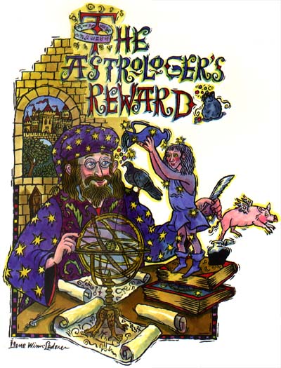 find his own world orbiting around the stars... Quickly, the water carrier delivered his days orders and headed home to hatch his plans. On the way, he saw a travelling merchant whose cart was piled high with books and assorted furnishings. Counting out his last few coins, Phineas purchased a bolt of cheap velvet, a pair of gold-framed spectacles, and a leatherbound book on astrology. Noticing his customers choices, the merchant reached deep into his cart and extracted a tiny brass model of the heavens which he ceremoniously handed to Phineas. "No astrologer worth his stars should be without it!" he gushed. The water carrier just nodded vigorously to disguise his uncertainty. Although poor Phineas could neither read or write, he listened carefully as the merchant launched into some cosmic chit-chat about ecliptics, ephemerides and signs of the zodiac ."What on earth is all that stuff?" Portia Pigeon gaped as he arranged his purchases on their straw-filled pallet. While the water carrier sketched his dream of the good life for his starry-eyed wife, she helped sew the long velvet robe and matching tasseled beret which would be his costume. Next, she watched him practice impressive-looking gestures as he manipulated the knobs on his tiny brass heaven. As her husband thumbed through the astrology book trying on his best authoritative facial expressions, Portia tried hard to keep a straight face. At last, she gave him a kiss for luck, and the Astrologer in full regalia strode pompously through the village towards the castle. Curious heads turned to watch him, but no one recognized Phineas the water carrier. |